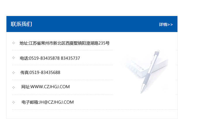 地址:常州市新北區友邦商務大廈1幢16、17層  電話:0519-85101652  傳真:0519-85112595  郵編:213022  網址:www_cz-jiayue_cn.nhtmzy.com  郵箱:xiajifengaa@163.com